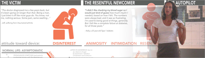 That capture the prevailing attitudes that patients assume towards their disease during each of the unique phases. The attitudinal archetypes are distinct and relatable patient typologies that in turn influence disparate disease management modalities. - Emotional context
