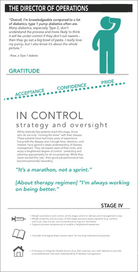 Interestingly, the design attributes that might foster these behaviors vary across those stages identified, as attitudes towards disease management (and consequently user needs) shift from that of denial and resistance to acknowledgement and acceptance. A deep understanding of the emotional drivers within each stage can help determine tangible design guidelines for each of the archetypes defined.